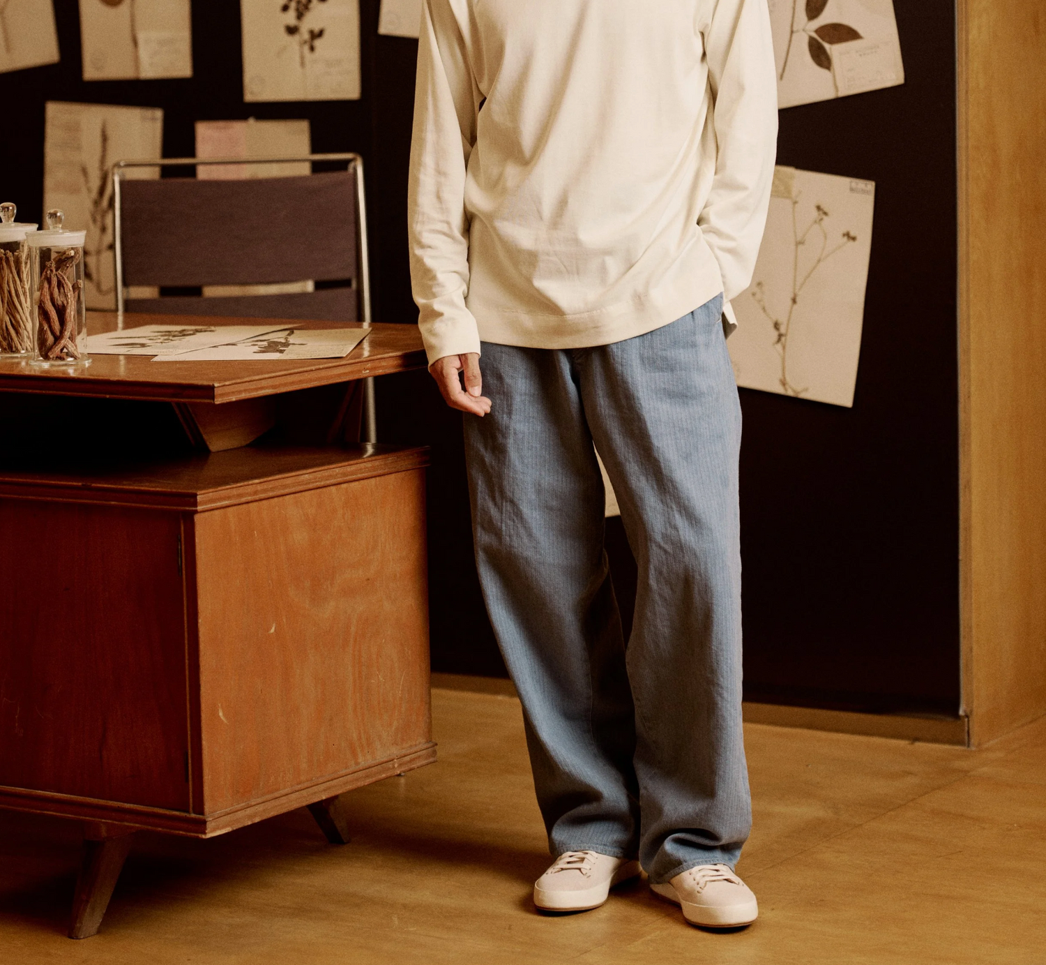 昨年からここ最近、お客様と話していてよく出てくるのが「最近ちょっと裾、広くなりました?」というひと言。 おしゃる通りで、これまでは裾幅21〜24cm前後を中心にご案内してきましたが、たしかにほんの少しだけ変化があります。たとえばMotiv Mfgのこちらのパンツは、サイズ32で裾幅約25.5cm。わずかな差ですが、穿くと印象が変わります。 アウトサイドを腿の付け根から膝にかけてわずかにカーブさせることで、ニュートラルなボリュームを出しています。太めが好きな方にも馴染みやすいバランスです。 靴の履き口の幅とも関係してローファーや、ロープロファイルなスニーカーとも相性も良く、足元が軽快になるこれから膝から裾に変化があるだけで、全体のフォルムがやわらぎます。 素材には、本来アウターにも使われるダブルフェイス(両面どちらでも使える)のリネンを使用。膝から裾にかけてゆるやかに落ちるラインが新鮮で、素材と色のおかげかクリース入りながらこなれたカジュアルな雰囲気に。 トップスが軽くなっていくこれからの季節。だからこそ、これからはパンツの鮮度がより大事になってくる気がします。 大きな変化ではありませんが、バランスの再調整です。新しい季節、まず足すならパンツからいかがでしょう。 Mod./Pier Trouser Fab./Linen Cotton Serge Col./ Navy