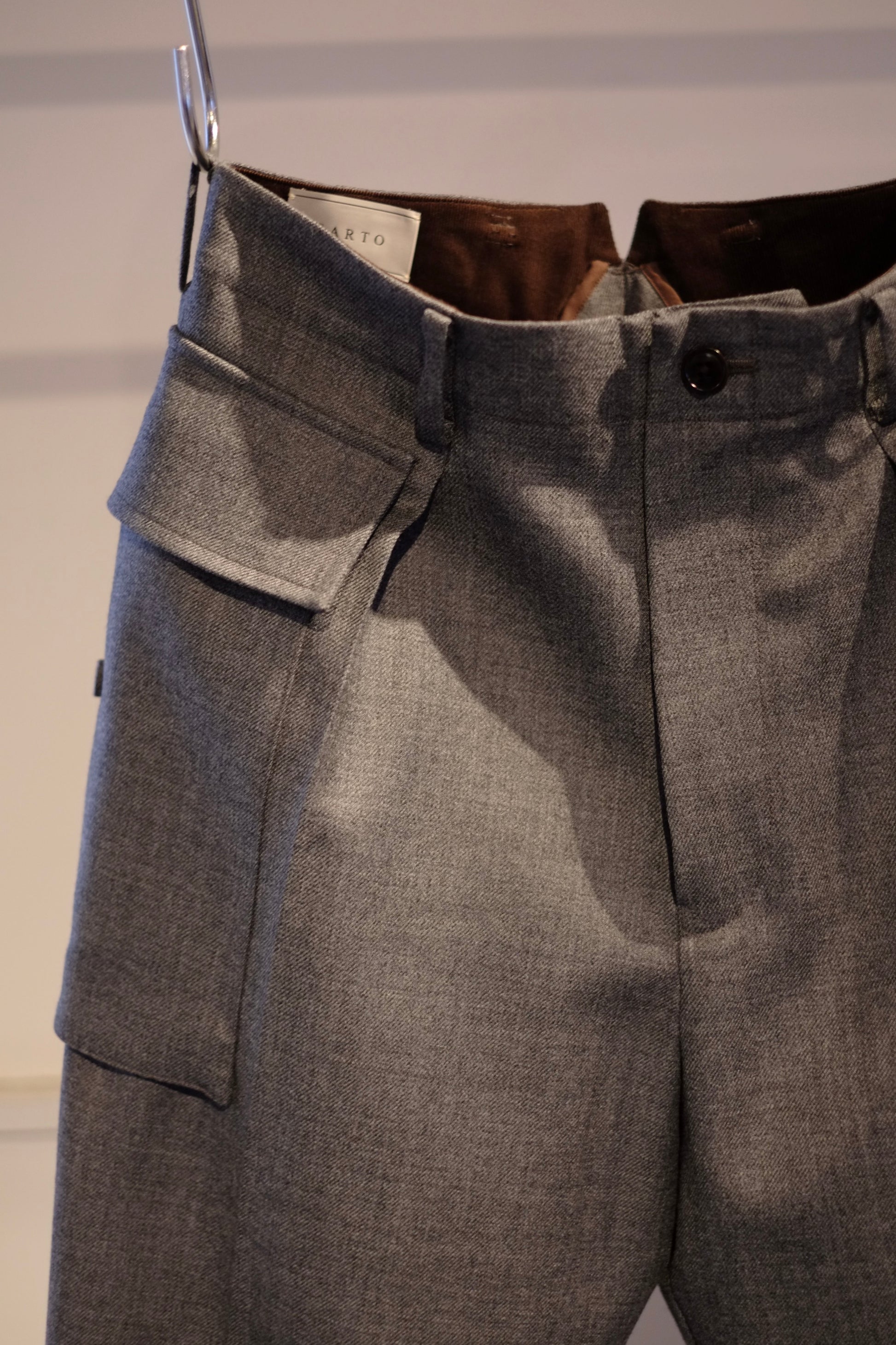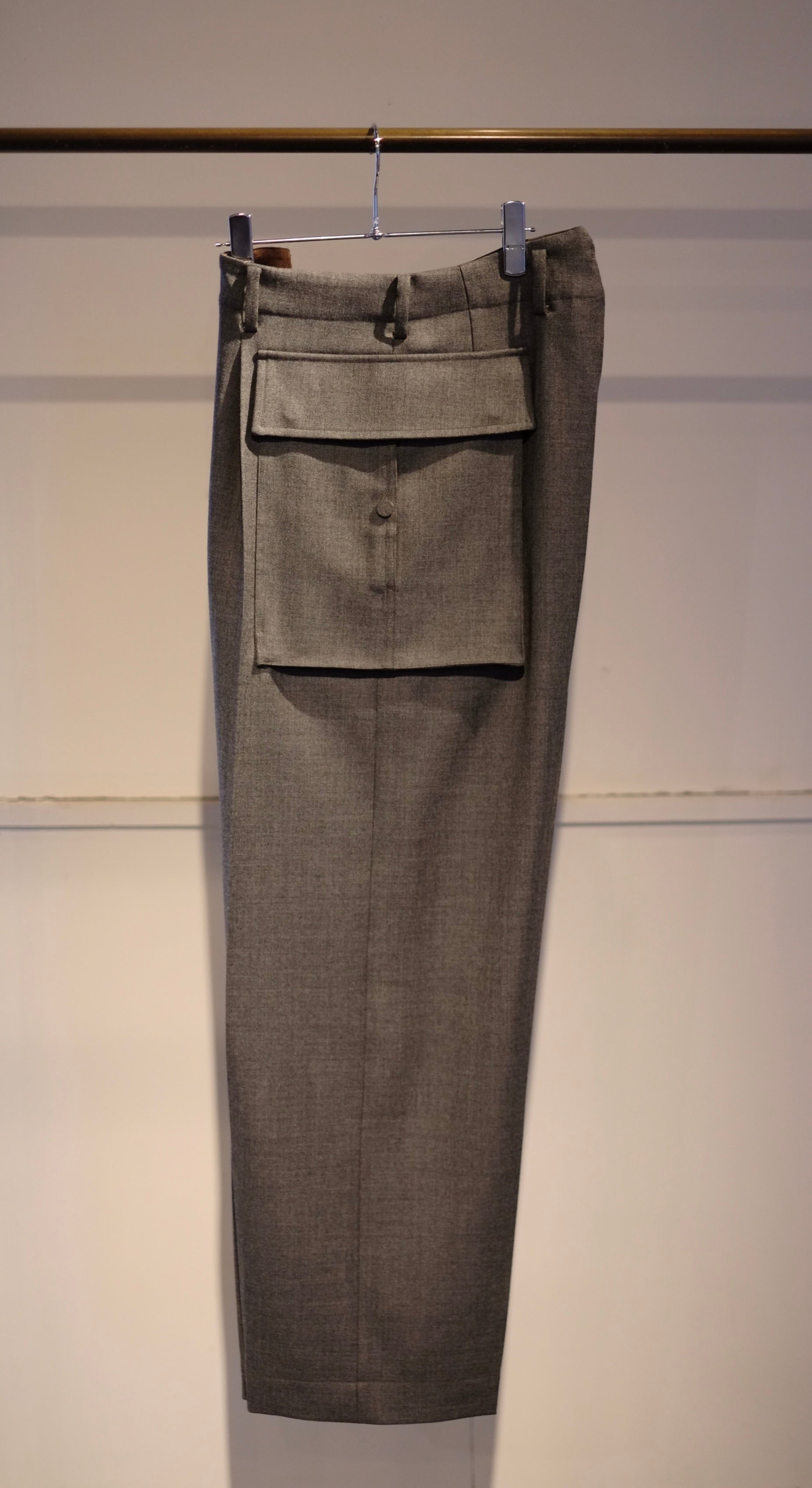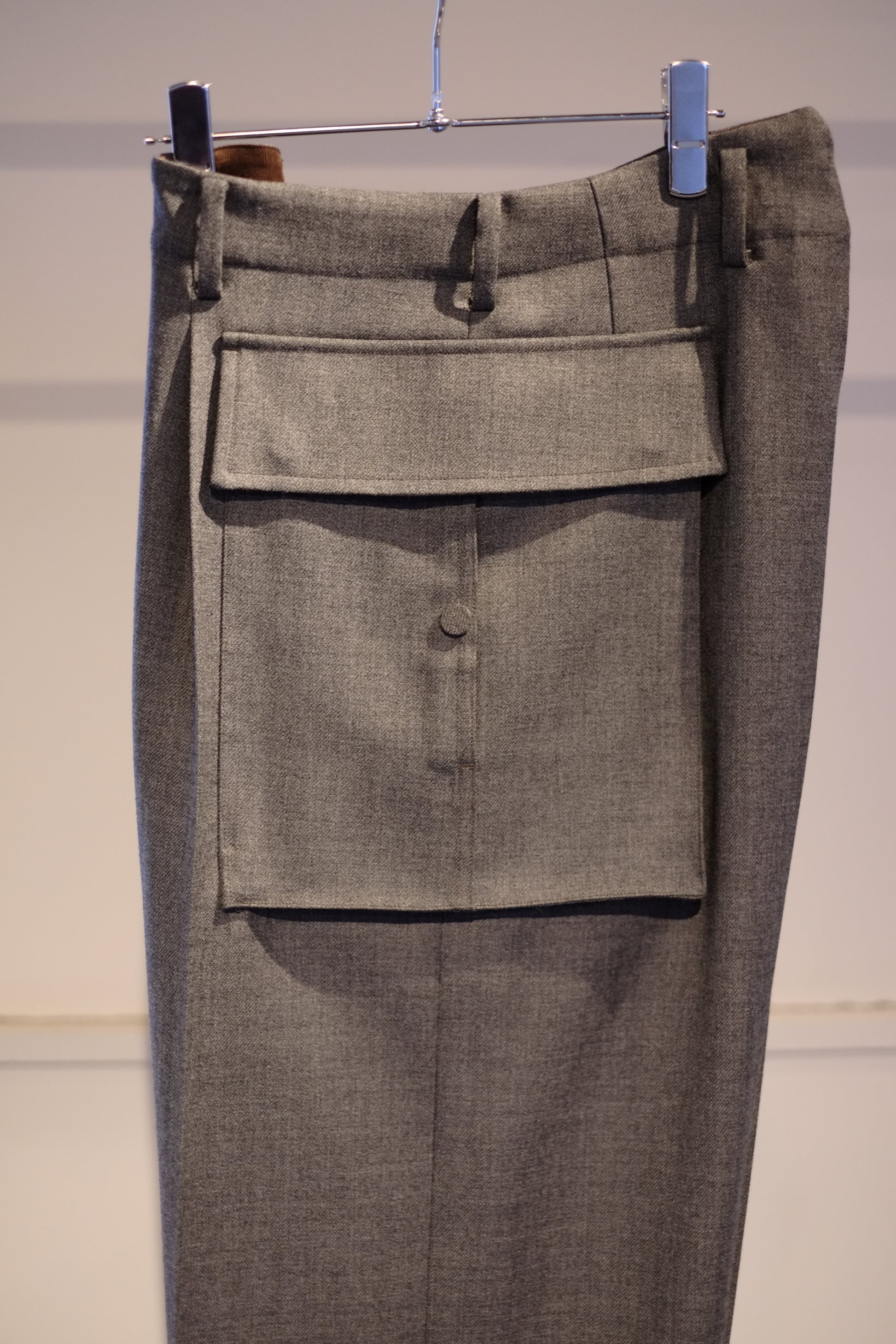 ミリタリー由来のディテールを兼ね備えたトラウザーは、製作背景の強みを生かした仕上がりで腰のコーデュロイが別布で使用されたり、ボタンを共生地で包んだりと細部まで