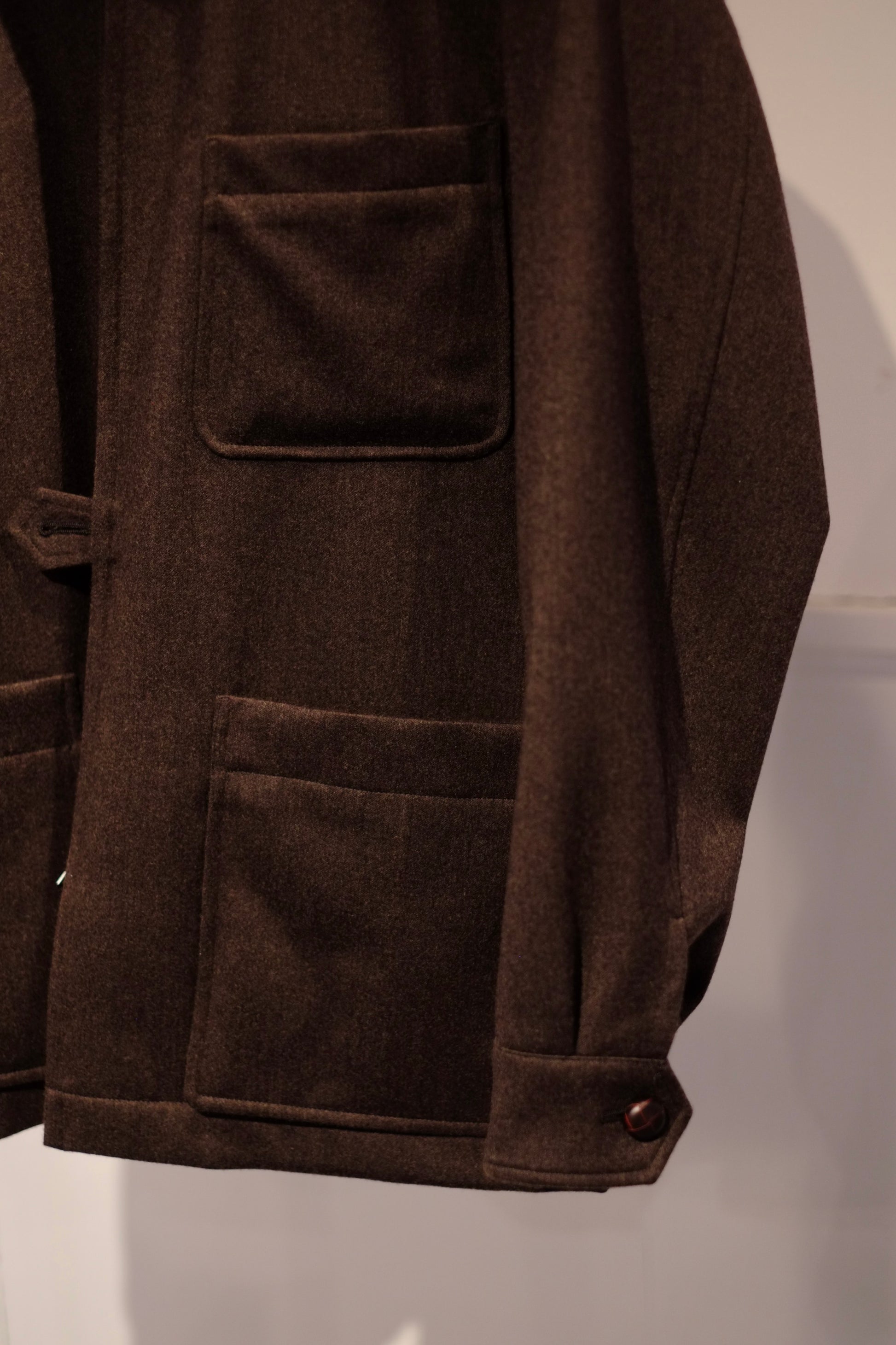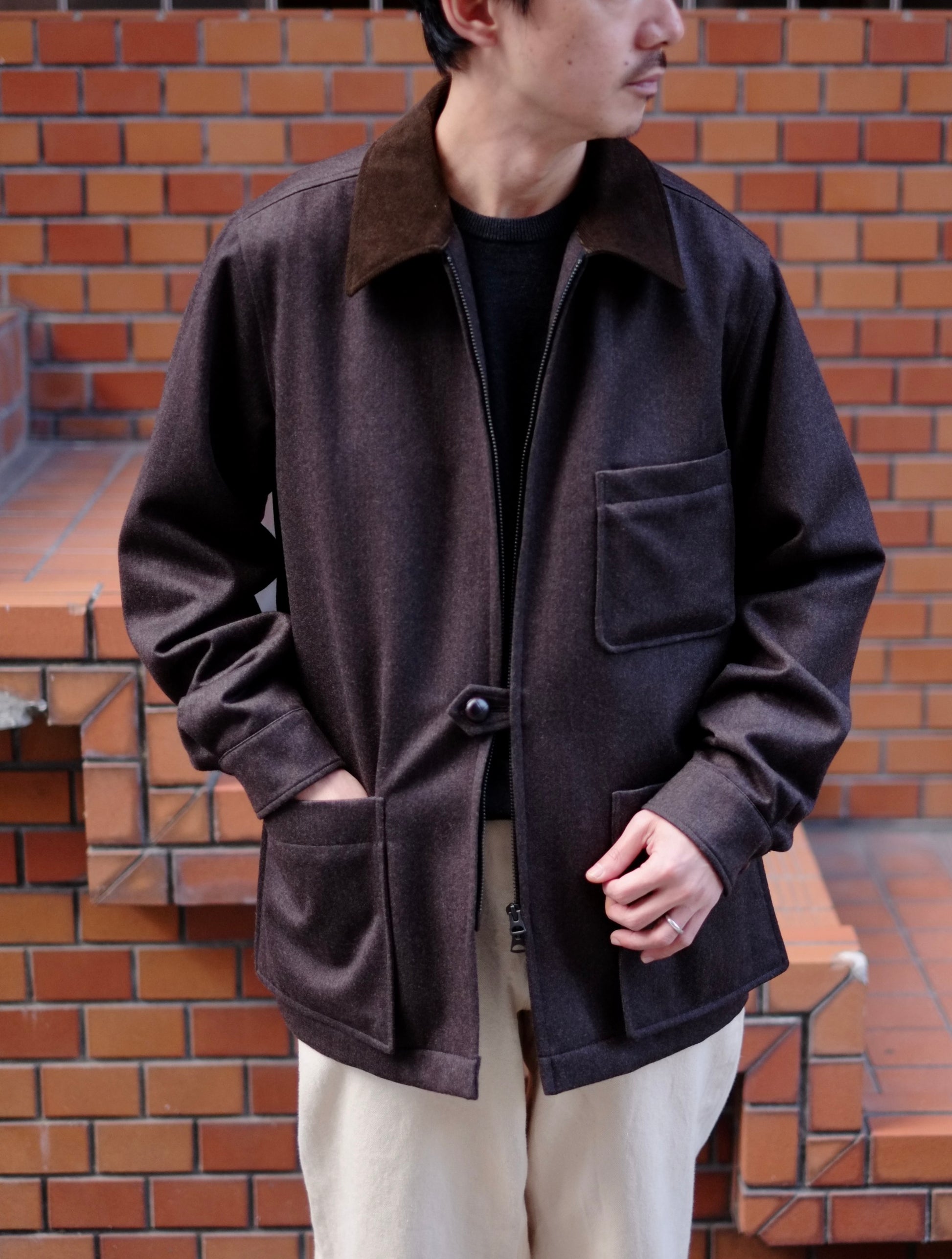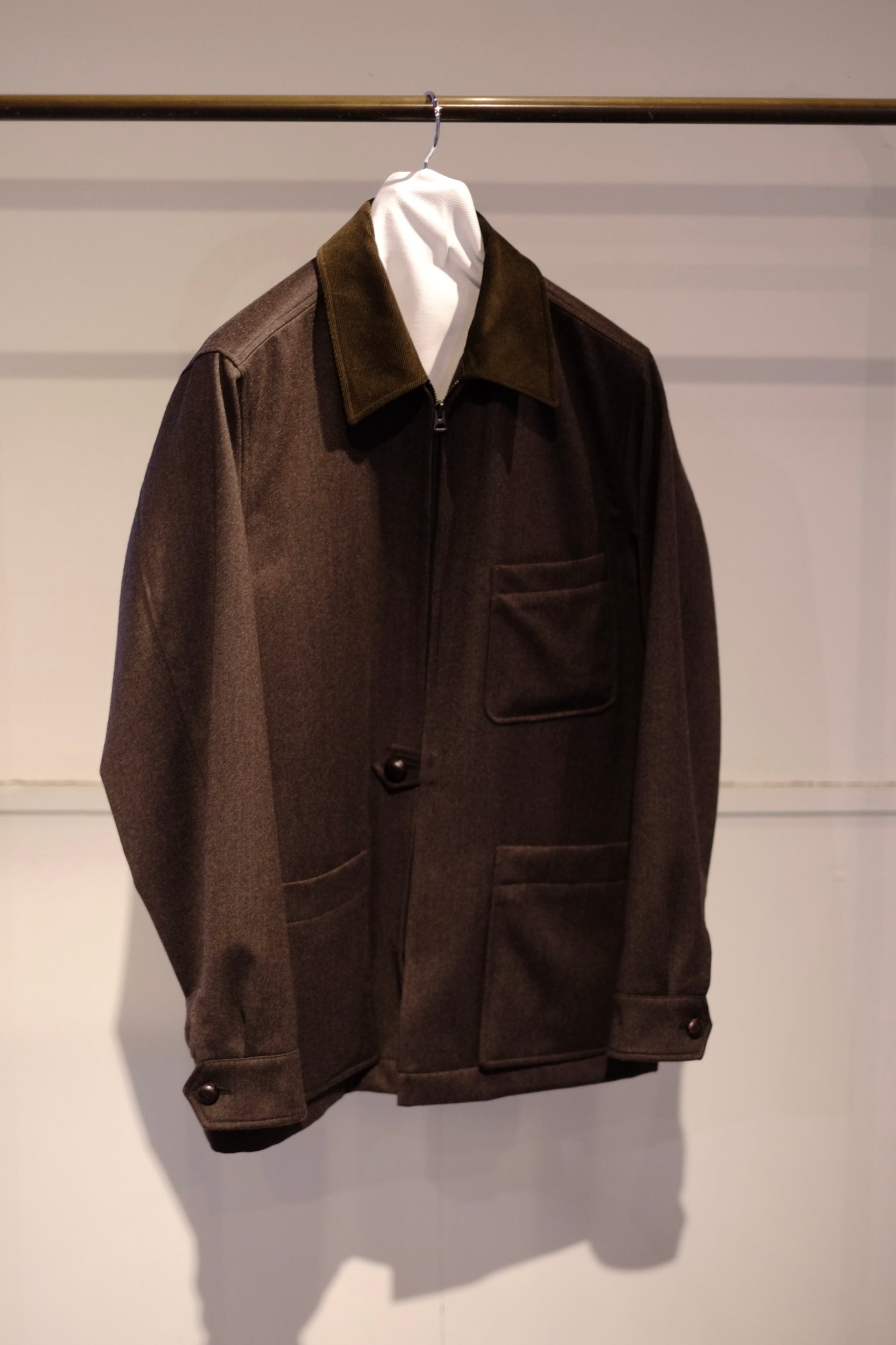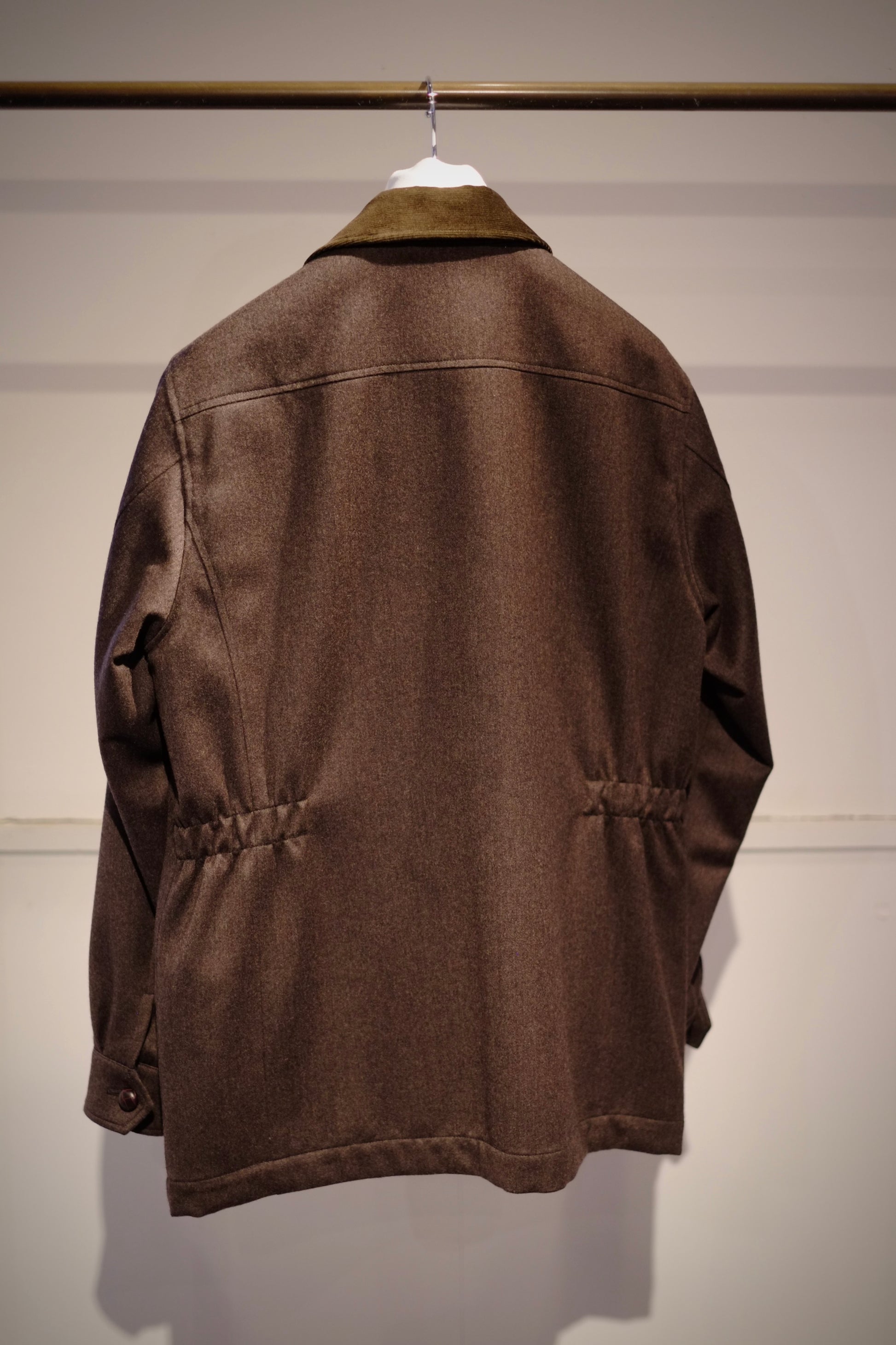 両サイドのギャザーやガゼット付きの腰ポケット、レザーのくるみボタンなど、トラディショナルな材料と付属を使いながらもどこか気品を感じさせるハンティングジャケットのようで、今着たいと思わせる温度感が散りばめられています。