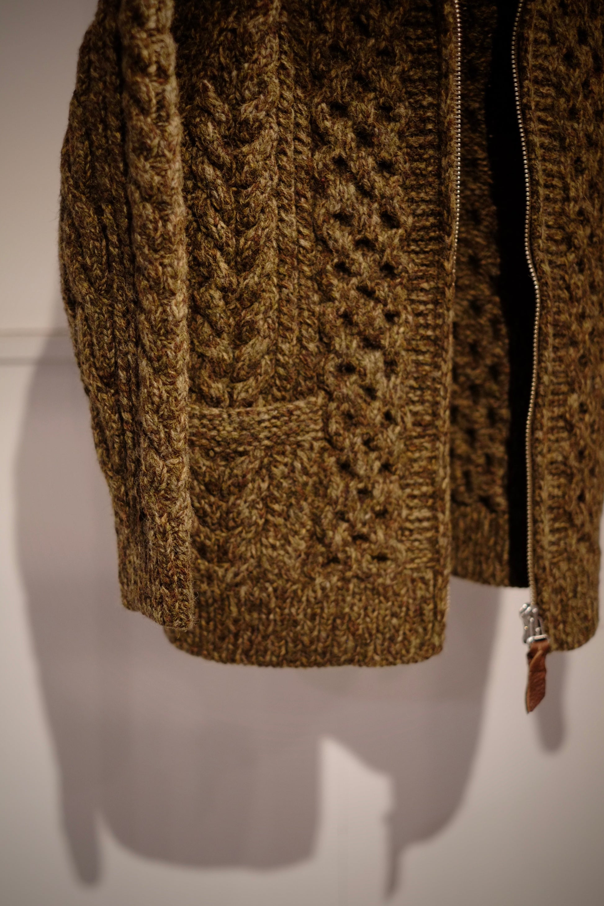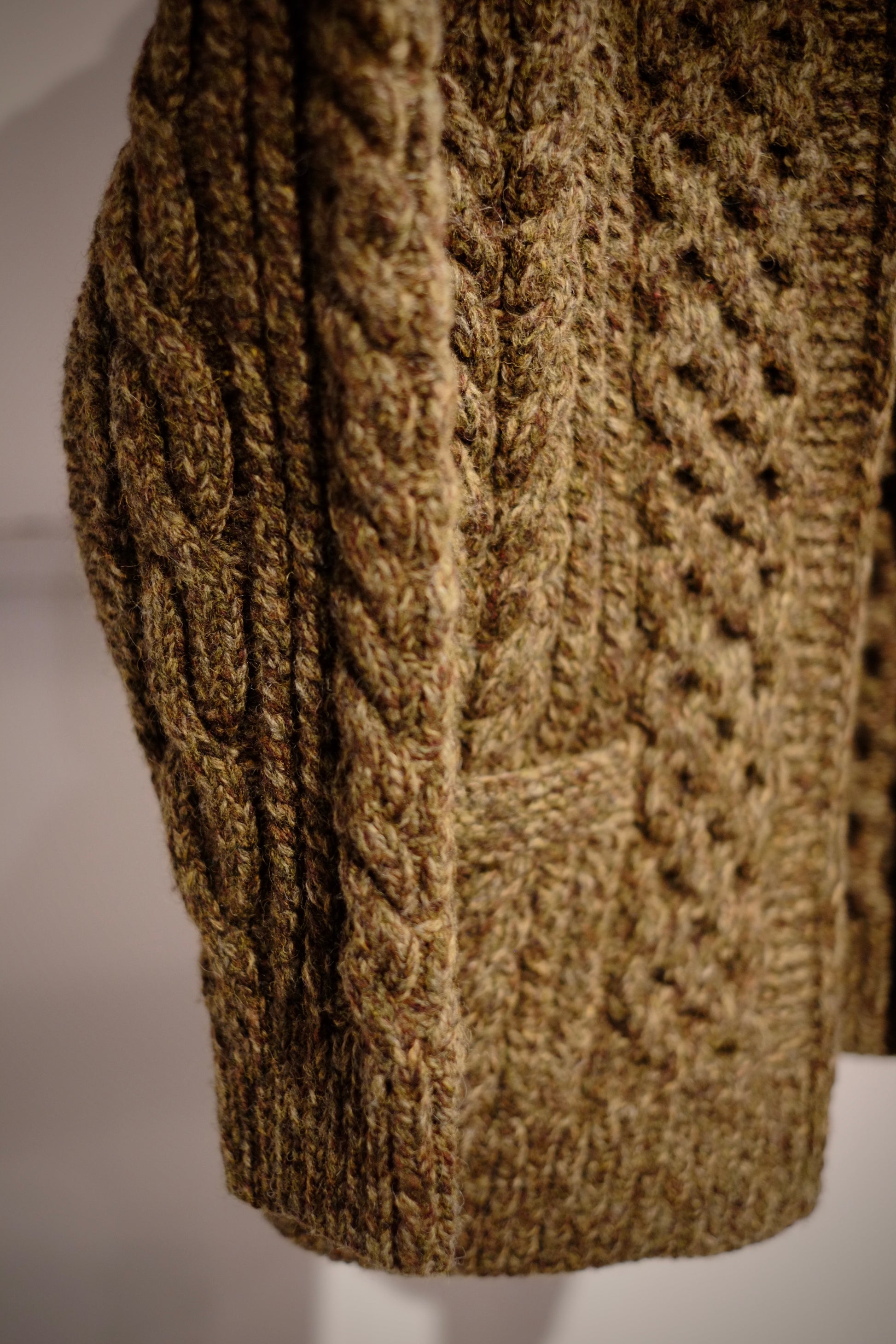 立体的なアラン柄とミックスカラーの糸が表情豊かで、シェットランドウールならではの奥行きある質感。
