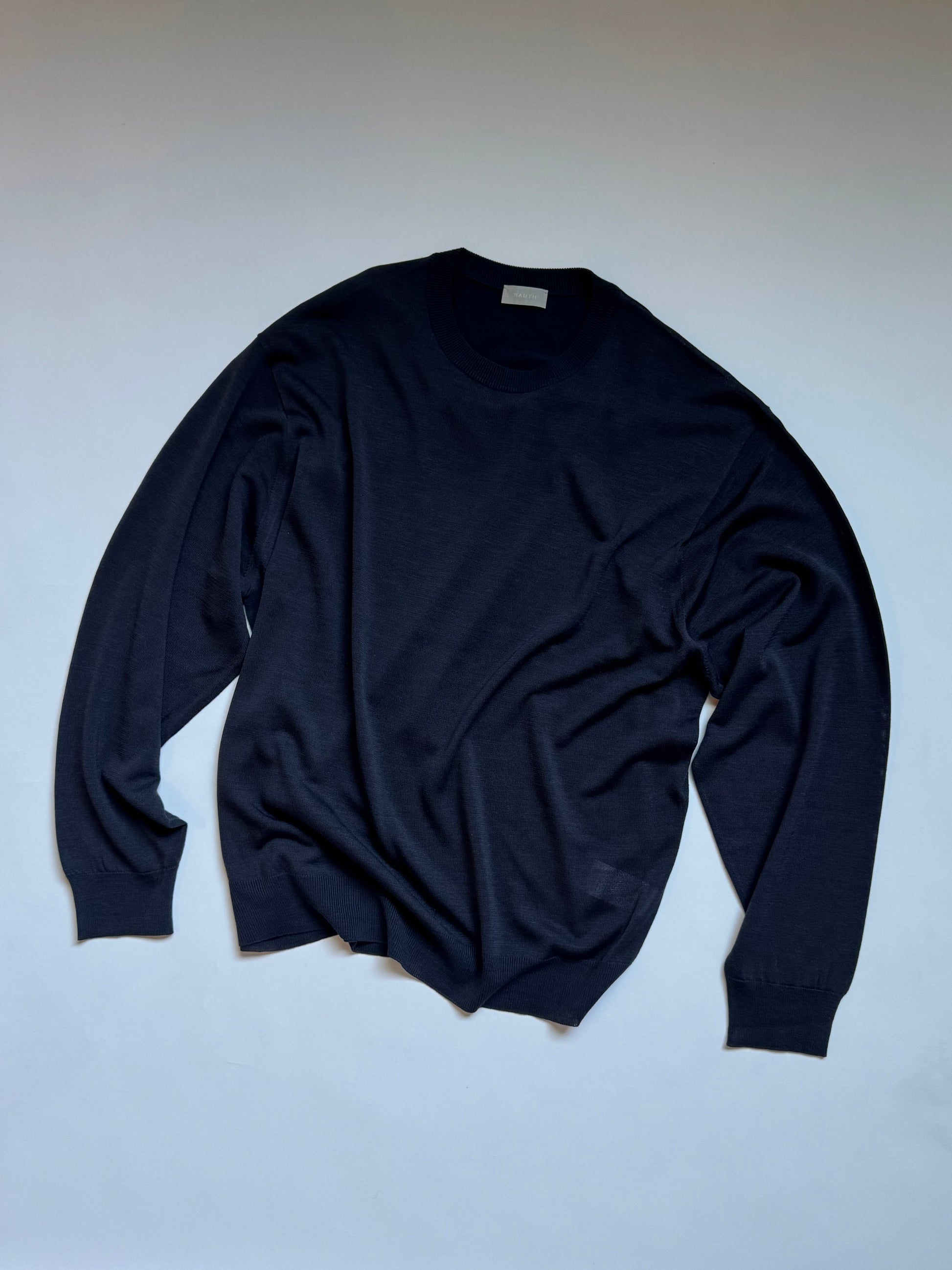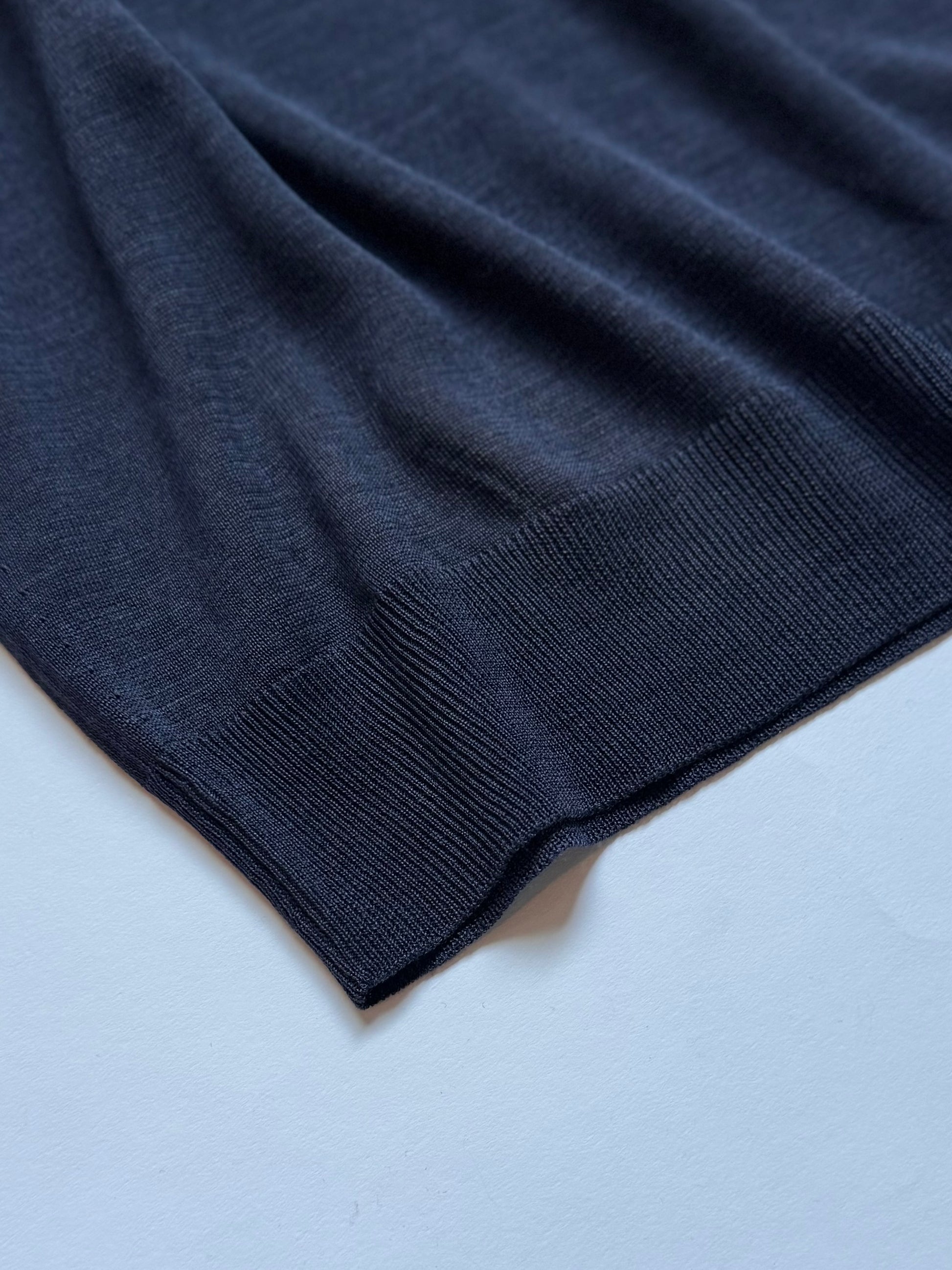 表にシルク糸、裏に強撚ウールシルク糸を配した、プレーティング編みのハイゲージニット。