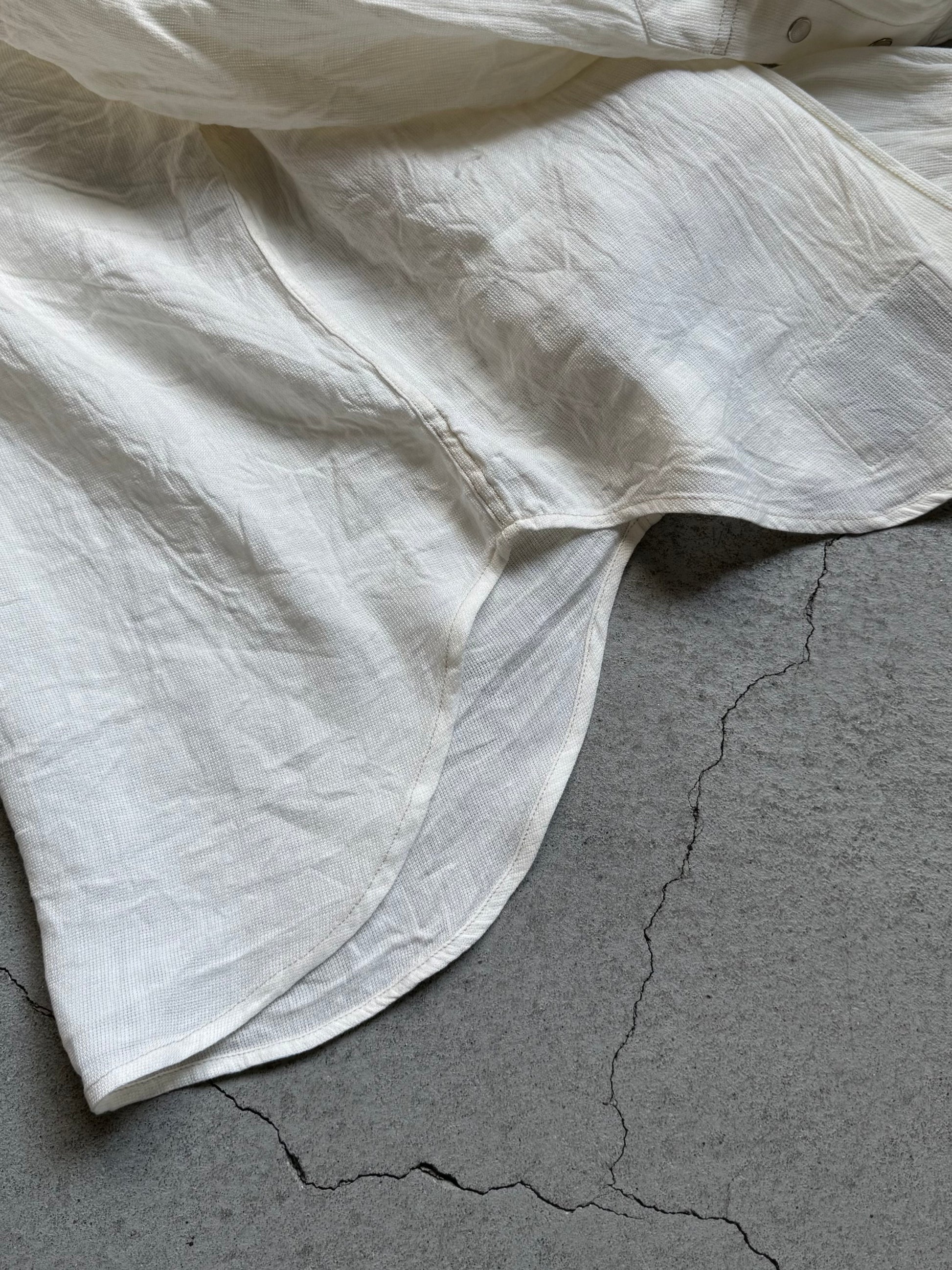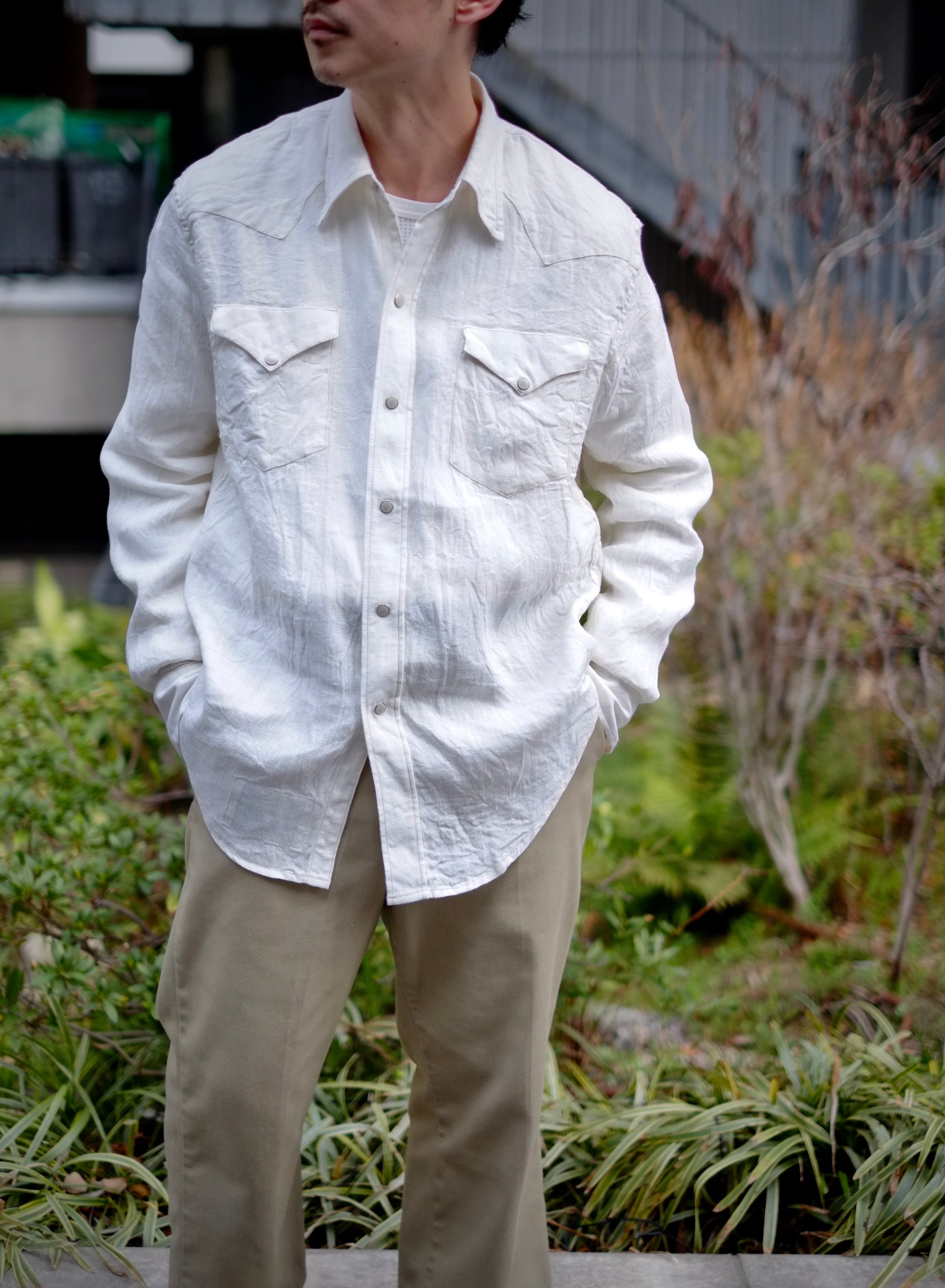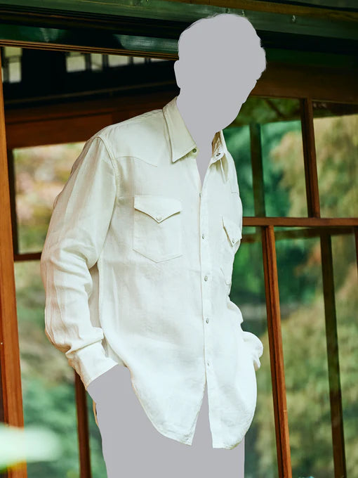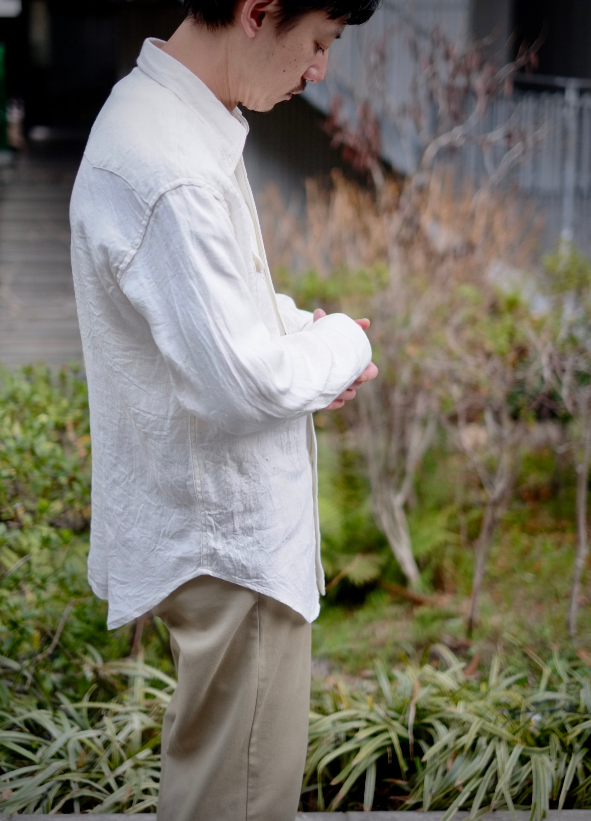 オリジナルデザインのシャツは、ヨーク、カフスレングス、イチゴボタンなどに表れています。新素材として採用したリネン・レーヨンは、かつてミリタリーウェアに用いられたメッシュ構造の発想をもとに、通気性と快適性をさらに高めるために再構築。