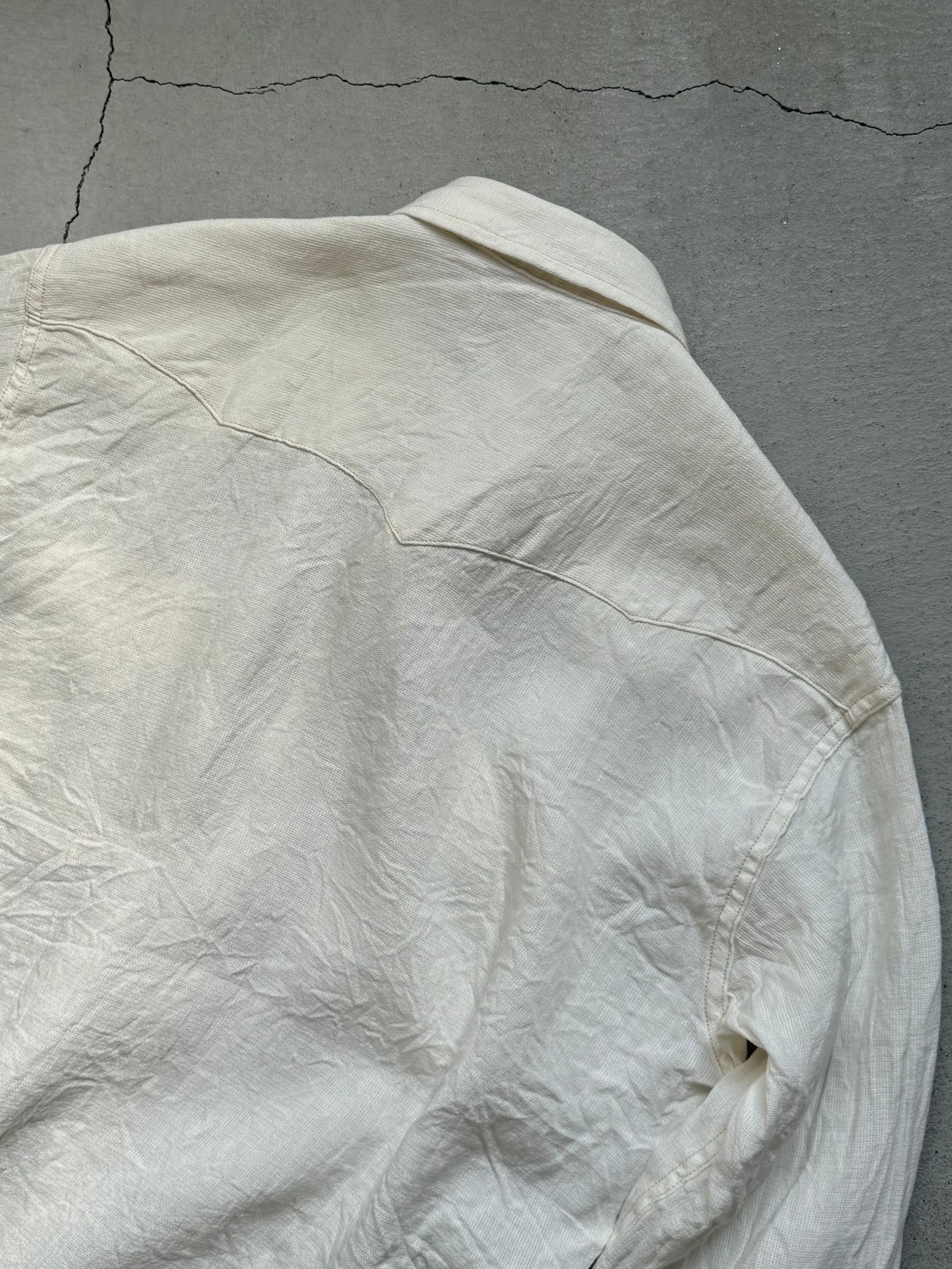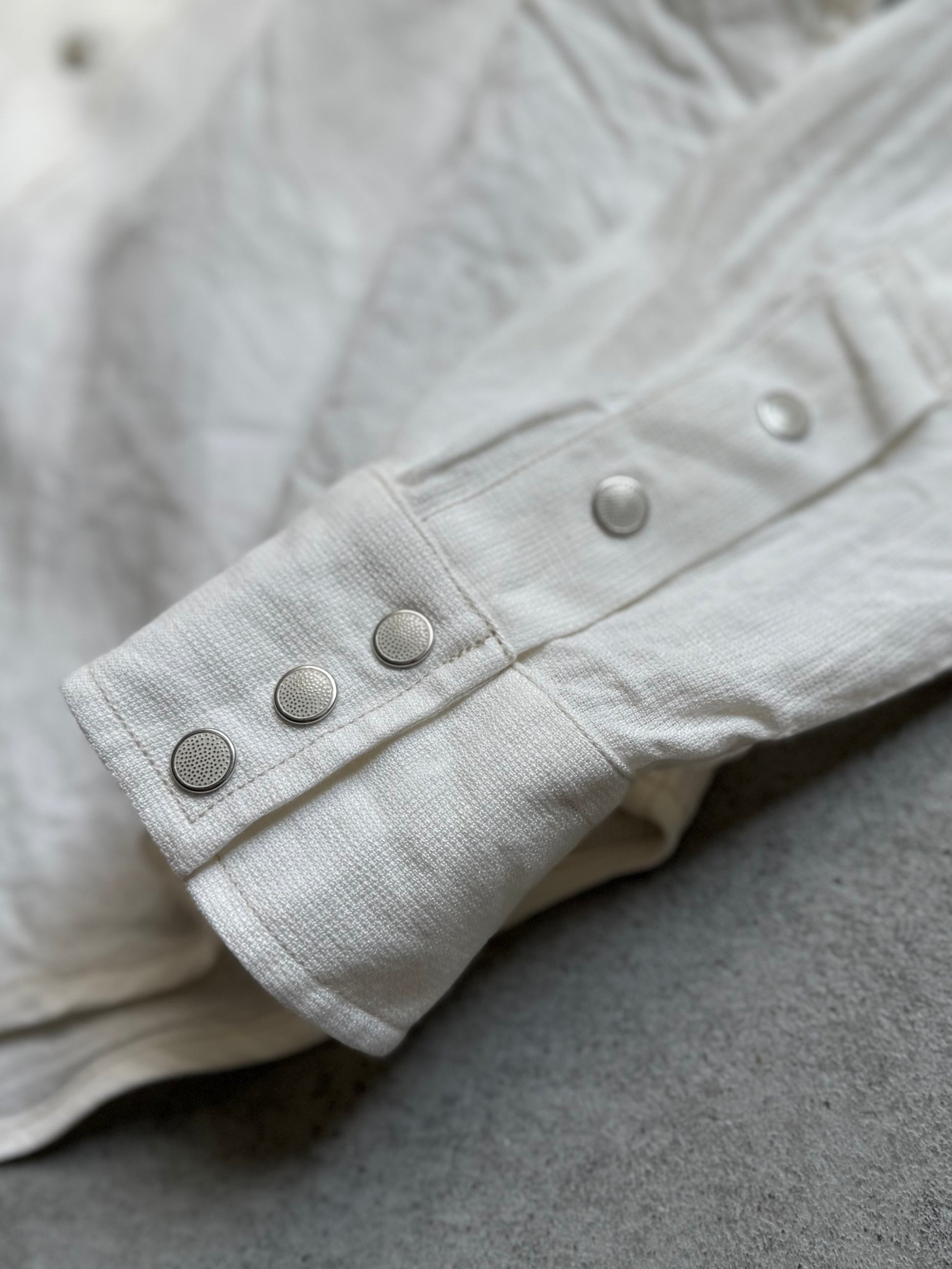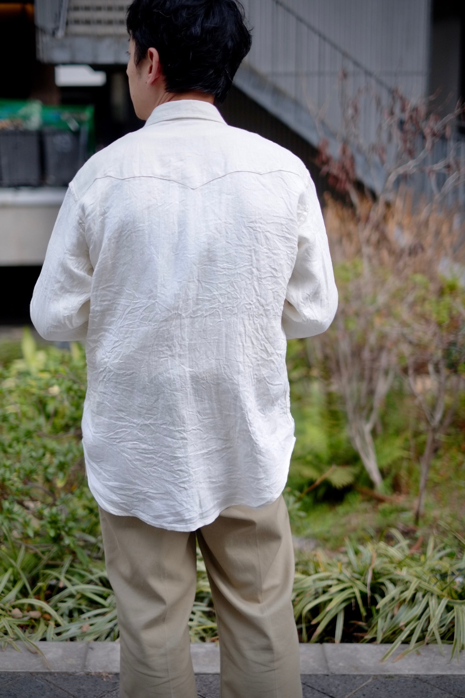 オリジナルデザインのシャツは、ヨーク、カフスレングス、イチゴボタンなどに表れています。新素材として採用したリネン・レーヨンは、かつてミリタリーウェアに用いられたメッシュ構造の発想をもとに、通気性と快適性をさらに高めるために再構築。