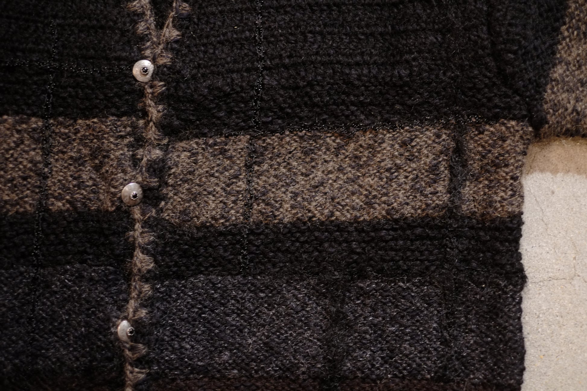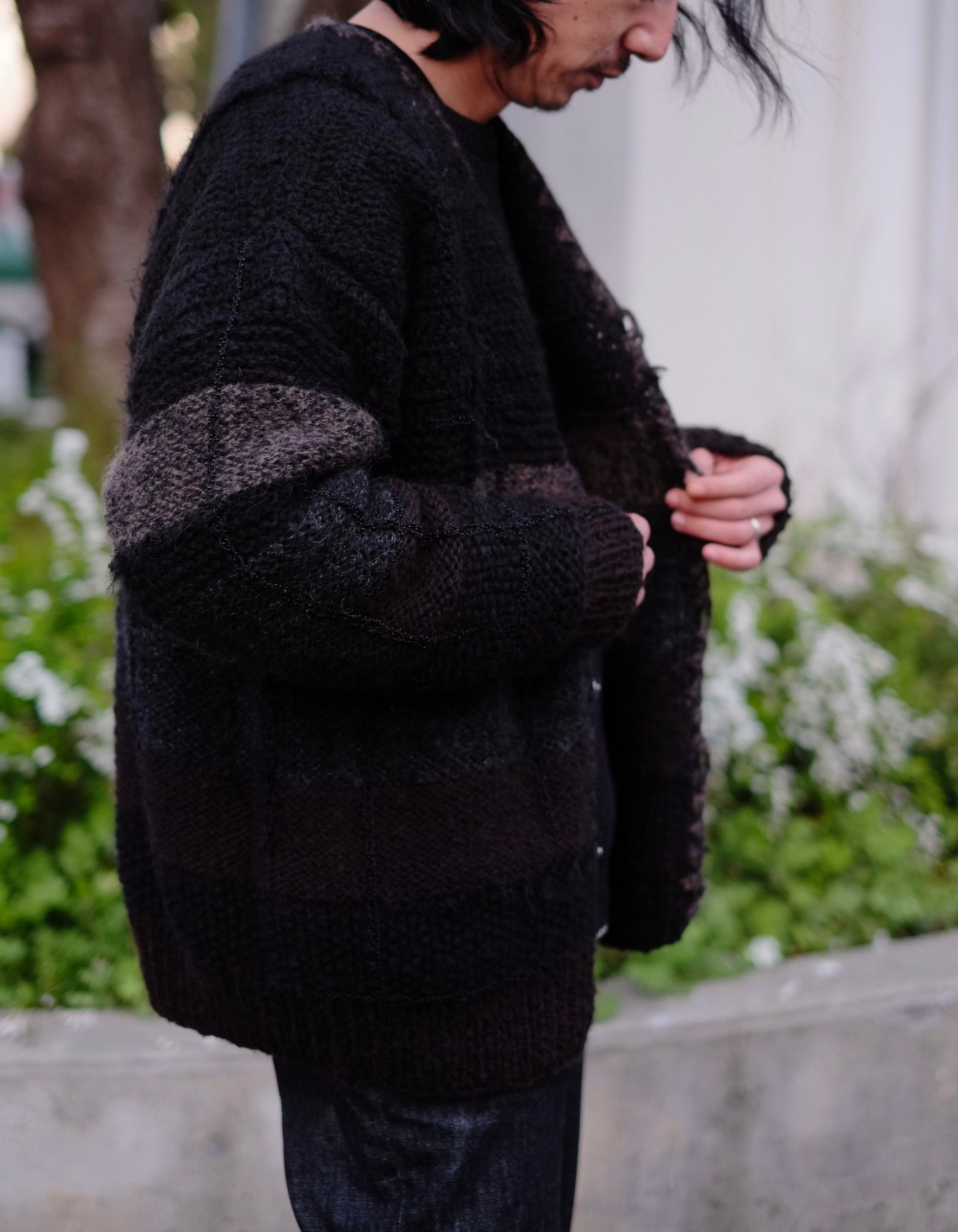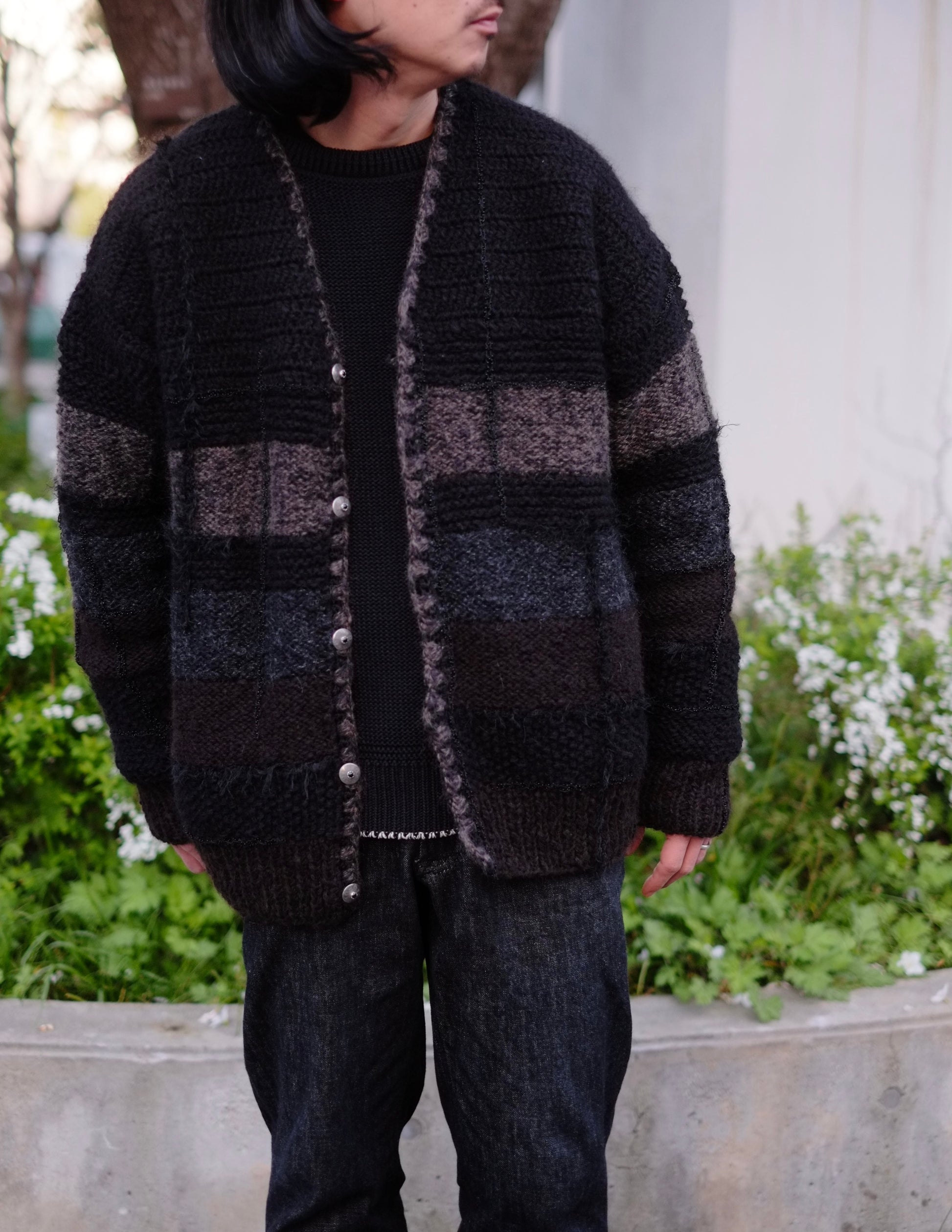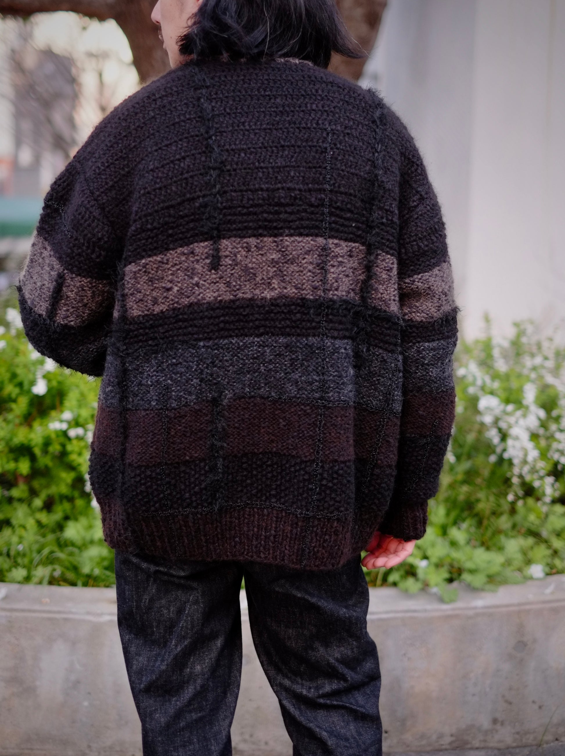 モヘア ナイロン ウールとコットンを撚り作成したオリジナル糸を使用したハンドニットカーディガン。4色のオリジナル糸をそれぞれ編み地を変えてボーダー状に構成し、肩まわりや襟ぐり、前立てにはかぎ針を使用。