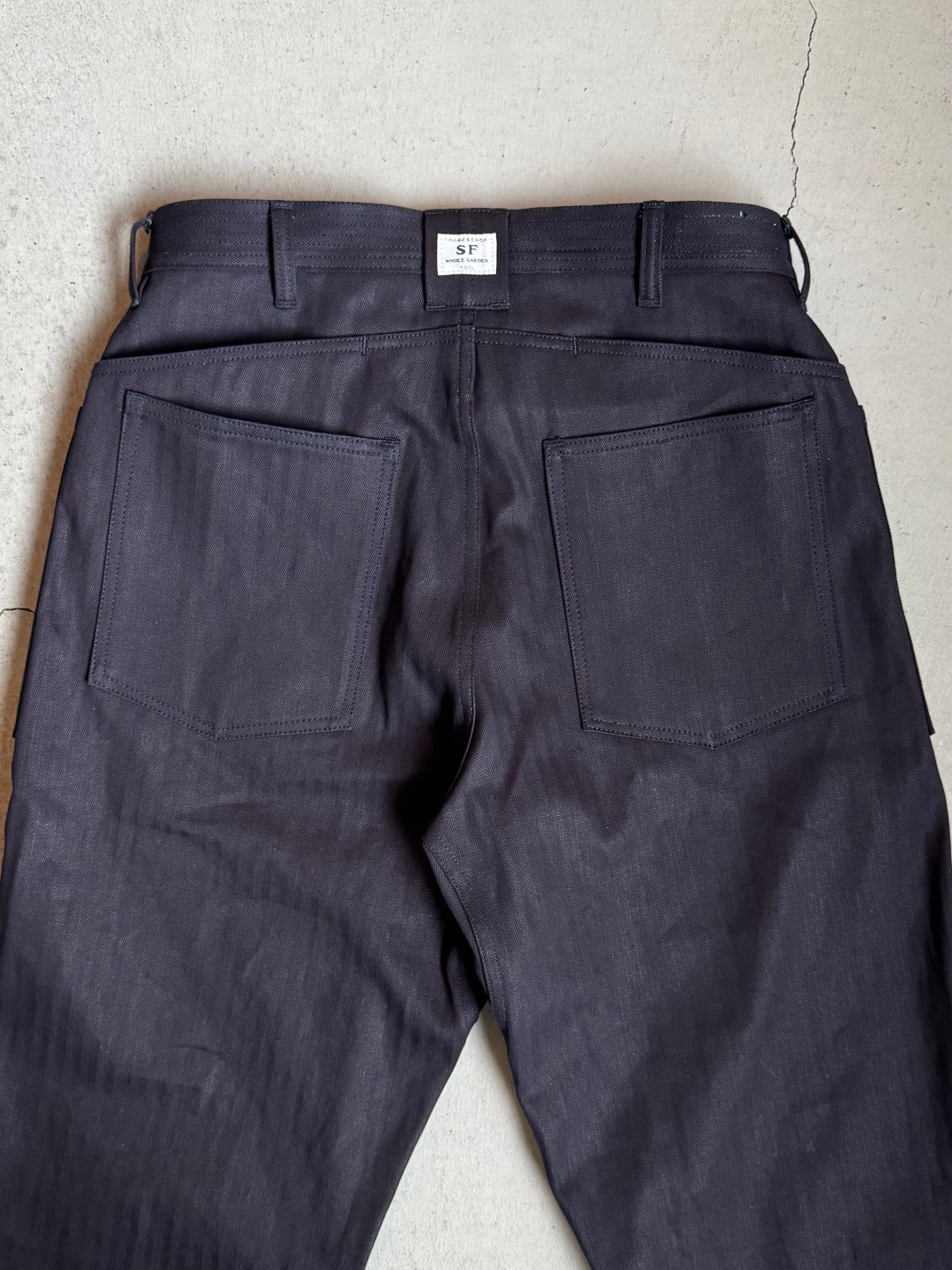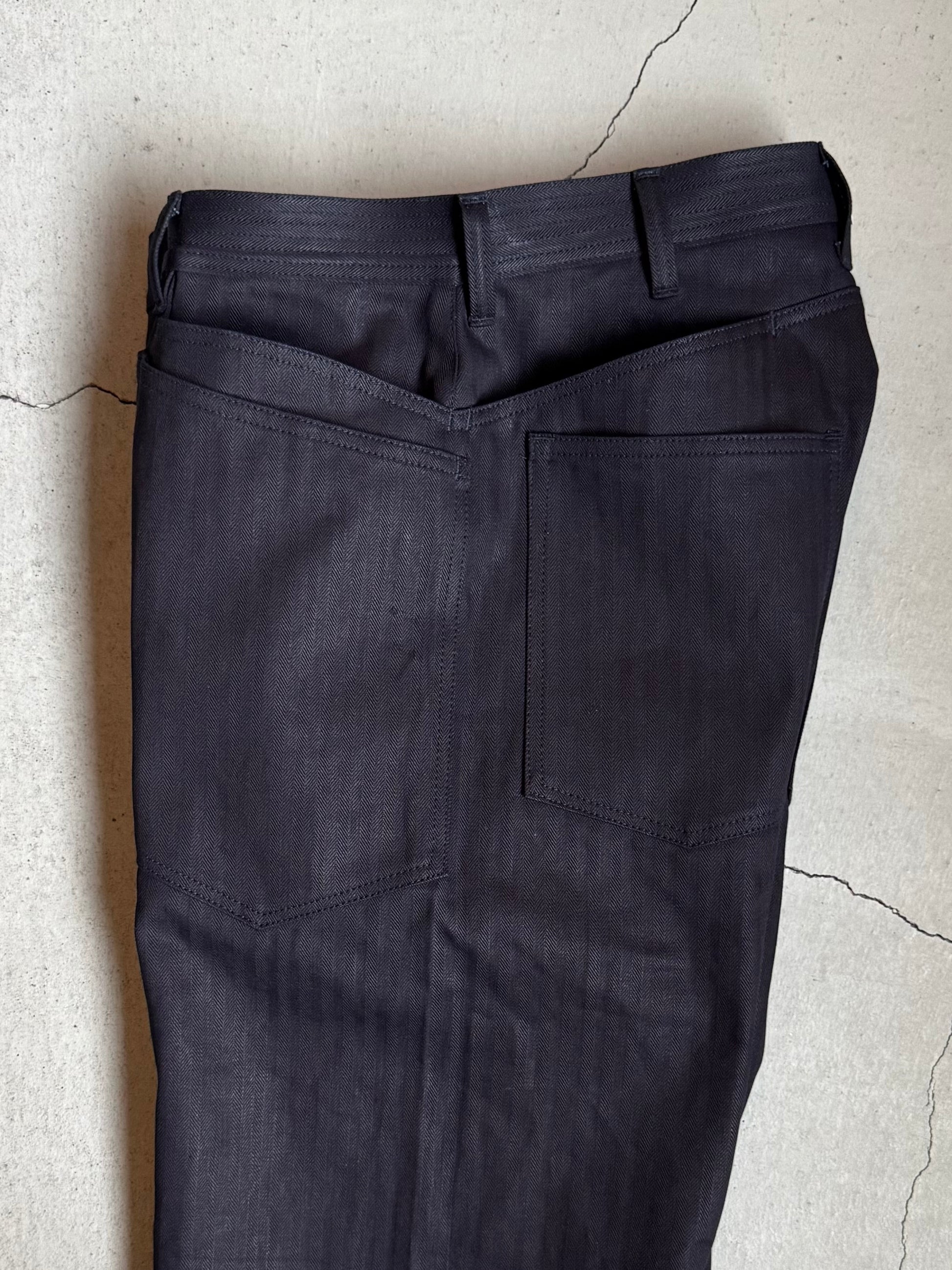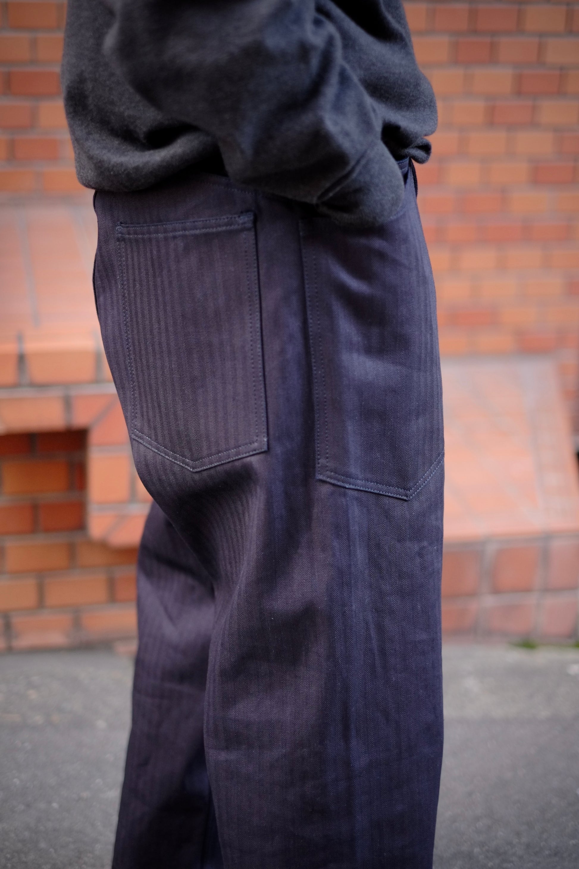 素材には、同色ステッチを施したインディゴとブラックのヘリンボーンデニムを採用。織りによる奥行きのある表情と耐久性を持ちながら、スタイリングにも取り入れやすいニュアンスを備えています。